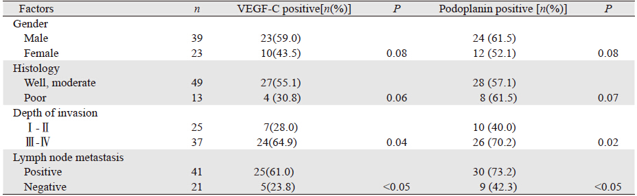 1.3 结果判断标准VEGF-C与Podoplanin阳性物质呈细颗粒状,位于细胞质,以胞质呈现棕黄色为阳性细胞,计算5个高倍视野中阳性细胞所占的比例: 阴性:阳性细胞<5%;阳性:阳性细胞≥5%。以Podoplanin阳性着色的单个内皮细胞或内皮细胞簇计数为1个微淋巴管。肿瘤组织首先在低倍镜下随机选择3个淋巴管着色最密集的区域,然后在400倍光学显微镜下分别计数淋巴管数,取4个视野的均值作为微淋巴管密度(LMVD)[4]。