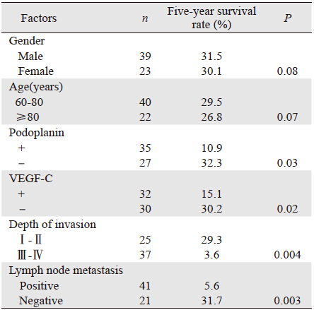 同时,我们对此次入组试验的老年患者进行随访,单因素分析显示:Podoplanin、VEGF-C、肿瘤浸润深度和淋巴结转移与老年直肠癌患者预后相关(P<0.05),而性别、年龄对老年直肠癌预后无显著性影响。多因素分析显示:肿瘤的浸润深度、Podoplanin、VEGF-C的表达水平和淋巴结转移是影响老年直肠癌并淋巴结转移患者生存预后的独立因素(P<0.05)。因此,Podoplanin、VEGF-C的表达水平和淋巴结转移癌也许可作为老年直肠癌预后判断的辅助指标,并且对制定直肠癌患者术后的随访计划有一定的参考意义,这为将来的临床应用提供了理论基础依据。