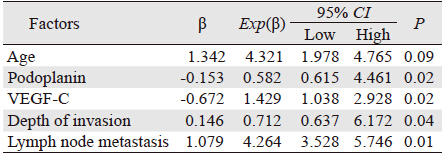 2.4 单因素及多因素分析结果本组病例的随访期为6~92月,中位随访期为51.8月。单因素分析显示VEGF-C、 Podoplanin、肿瘤浸润深度和淋巴结转移与老年直肠癌患者预后相关(P<0.05),而性别,年龄对直肠癌预后无显著性影响。多因素分析显示,VEGF-C、Podoplanin和淋巴结转移是影响老年直肠癌患者生存预后的独立因素(P<0.05),见表 3~4。