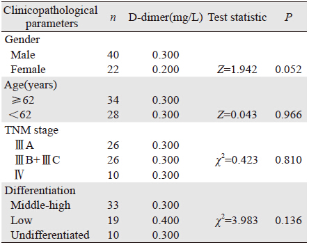 2 结果2.1 晚期贲门癌患者化疗前血浆D-二聚体含量在不同临床病理特征间的比较晚期贲门癌患者血浆D-二聚体含量在不同的性别、年龄、病理类型及临床分期各组间比较差异无统计学意义,见表 1。