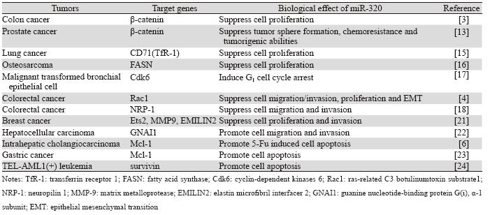 miR-320家族成员包括miR-320a、miR-320b、 miR-320c、miR-320d、miR-320e(http://www. mirbase.org),分别定位于人类染色体8p21.3、 1、18、13q14.11、19q13.32上。研究显示, miR-320的表达在肿瘤组织及正常组织中存在显 著差异。Sun等[3]利用实时定量PCR(quantitative reverse transcription PCR,QRT-PCR)技术在对3种 结肠癌细胞系及40例结直肠癌组织进行检测时, 发现miR-320a表达显著低于GES细胞系及邻近正常 组织,提示miR-320a表达下调可能是结直肠癌的 始动因素。此外,伴有远处转移的结直肠癌组织 较不伴有远处转移的癌组织,以及肝转移癌较原 发癌,miR-320a的表达同样下调,提示miR-320a 在肿瘤的进展期具有抑制肿瘤转移的作用[3, 4]。近 年来,在胆管癌[5, 6]、口腔鳞癌[7]、乳腺癌[8]、肺鳞 癌[9]等肿瘤中均发现miR-320表达下调,然而,在 视网膜母细胞瘤[10]、浆液性卵巢癌[11]、恶性转化 的支气管上皮细胞[12]中miR-320表达较正常组织细胞明显上调。以上研究结果提示,miR-320家族在 肿瘤中的异常表达及功能作用可能与组织类型密 切相关。肿瘤细胞内miR-320拷贝数的改变使下游 靶基因的表达异常,并最终影响肿瘤的增殖、凋 亡、迁移、侵袭等生物学行为,见表 1。因此,深 入探究miR-320在不同肿瘤中的作用有助于阐明肿 瘤的病因学及分子病理学机制。