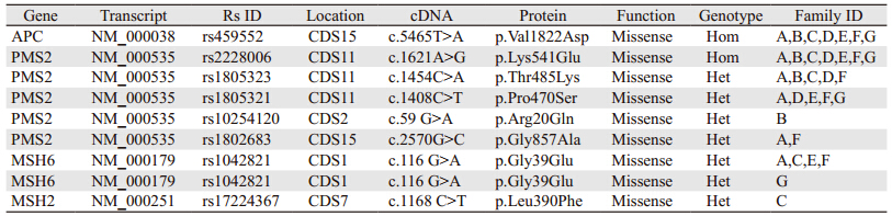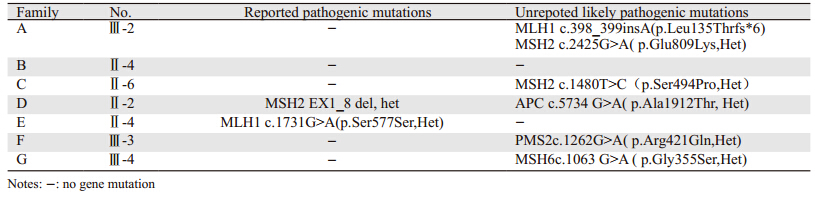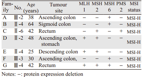 7个家系的先证者均行免疫组织化学(immunohistochemistry,IHC)及微卫星不稳定(microsatellite instability,MSI)状态检测,见表 1。发现他们均为高度微卫星不稳定。