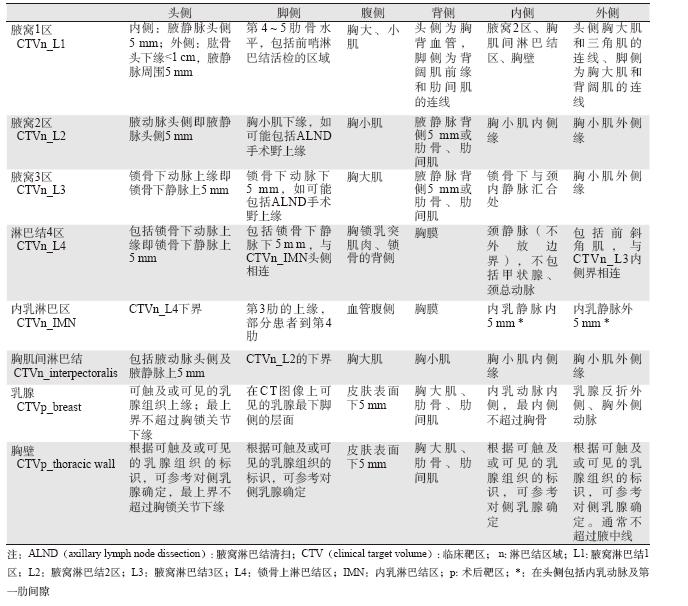 本指南的勾画实例是来自于2个典型的早期 乳腺癌患者,分别接受过保乳手术和乳腺癌改良 根治术。在进行模拟定位时,患者采用仰卧位、 乳腺托架固定(其托架板倾斜12°~15°、双上肢 外展约120°、头置正中且稍微过仰以避免下颈部 皮肤发生皱褶。在CT扫描前,在乳腺周围放置 两圈金属线(内圈为可触及或可见的乳腺组织 CTV、外圈为暂定的照射野边界),不需要增强 扫描,扫描层厚为2.5 mm。对靶区的命名也作 了相对统一的规定:在CTV后分别加n和p代表淋 巴结区域和术后原发肿瘤体积。将腋窝淋巴结分 为1~3区,锁骨上淋巴结区命名为4区,内乳淋巴 结区为IMN; 乳腺癌术后照射靶区包括保乳术后 的乳腺(CTVp_breast)或改良根治术后的胸壁 (CTVp_thoracic wall)。不同CTVn和CTVp的边 界定义见表 1。