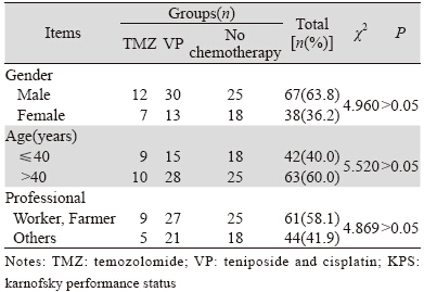 收集2011年1月—2014年1月在兰州大学第二医院和甘肃省肿瘤医院住院经手术切除并经病理学证实为脑胶质瘤,手术治疗为镜下全切或次全切,术后均采用三维适形放疗,临床资料比较完整的患者105例。男67例,女38例,男 :女为1.76,发病年龄11~71岁,平均年龄42岁,<40岁42例,≥40岁63例。KPS≥70(karnofsky performance status,KPS)。经术后病理证实,肿瘤级别Ⅰ~Ⅱ级36例,Ⅲ级38例,Ⅳ级31例。不同组间患者在性别、年龄、职业等方面比较,差异无统计学意义(P>0.05),具有可比性,见表 1。