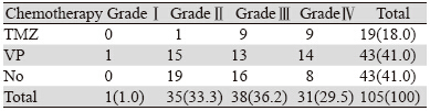本研究收集的脑胶质瘤患者治疗方案主要为手术联合放疗,部分患者接受化疗。所有患者全部完成显微镜下全切或次全切手术治疗,放疗总剂量均为60 Gy。105例中接受化疗的患者共62例(占纳入病例总数的59.0%),化疗方案主要有TMZ方案、VP方案[替尼泊苷(VM-26)联合顺铂(DDP)]。其中接受TMZ化疗的患者19例(占纳入病例总数的18.0%);接受VP方案化疗的有43人(占纳入病例总数的41.0%),见表 2。另外,本研究高级别胶质瘤(high grade glioma,HGG)患者共69例,其中45例接受化疗,TMZ方案18人(占化疗HGG患者总数的40.0%),VP方案27人(占化疗HGG患者总数的60.0%)(χ2=2.583,P<0.05)。