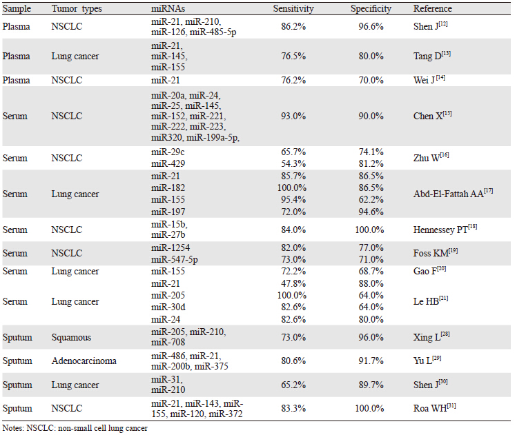 由于支气管上皮肿瘤细胞脱落后会随痰液排出体外,痰液miRNAs已经成为一种可用于肺癌早期筛查和诊断的肿瘤标志物[28, 29, 30, 31] ,见表 1。Xie等[27] 发现内源miRNAs具有抵抗RNA酶活性的能力,由此证明miRNAs能够稳定存在于痰液中。并且,与痰细胞学检测相比,痰miRNAs检测的敏感度更高,为痰液miRNAs用于肺癌的早期筛查和诊断奠定了基础。