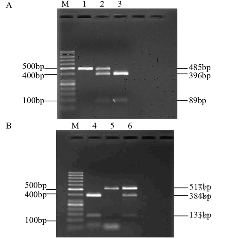 | M: DNA marker; 1: Arg/Arg homozygote; 2: Arg/Trp heterozygote; 3: Trp/Trp homozygote; 4: Arg/Arg homozygote; 5: Gln/Gln homozygote; 6: Arg/Gln heterzygote; A: The three fragments of XRCC1 codon194 incised by PvuⅡ restriction enzyme were 485bp, 396bp, 89bp, respectively; B: the three fragments of XRCC1 codon399 incised by Nci Ⅰ restriction enzyme were 517bp, 384bp, 133bp, respectively 图 1 PCR产物经限制性酶切后琼脂糖凝胶电泳图谱 Figure 1 Agarose gel electrophoretogram of XRCC1 genotypes using PCR-RFLP |