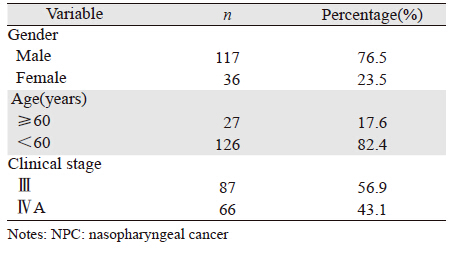 2 结果 2.1 病例最终入组情况共收集符合条件的鼻咽癌患者158例,剔除未完成2周期化疗、合并严重内科疾病、双重癌共5例,入组病例为153例,对其进行临床病理资料登记并随访至2014年1月31日,共随访153例并获完整资料,建立患者临床资料Excel数据库。入组患者年龄18~67岁(中位年龄47岁),患者临床资料见表 1。