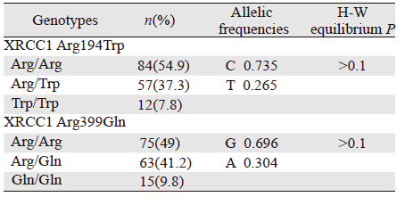 1.2.2 XRCC1基因检测分型采用限制性片段长度多态性聚合酶链反应(polymerasechain reaction-restriction fragment length polymorphism,PCR-RFLP)技术进行基因分型。引物由上海生工生物工程股份有限公司合成。聚合酶链式反应(polymerase chain reaction,PCR)分别扩增含XRCC1 codon194和codon399多态位点的DNA片段。前者的引物为5'-GCCAGGGCCCCTCCTTCAA-3'和5'-TACCCT CAGACCCACGAGT-3',后者的引物为5'-TCCT CCACCTTGTGCTTTCT-3'和5'-AGTAGTCTGCT GGCTCTGGG-3'。PCR反应体系:25 μl PCR混合液中含0.1 μg模板DNA、0.4 μmol/L各引物、0.1 mmol/L dNTP、1.5 mmol/L MgCl2、1.0 U Taq聚合酶及其1×反应缓冲液。PCR条件:95℃预变性5 min后,于95℃ 30 s,61℃ 30 s和72℃ 45 s进行35个循环,最后72℃延伸10 min。分别取5 μl XRCC1 codon194或codon399的PCR产物与限制性核酸内切酶PvuⅡ或NciⅠ于37℃温育过夜。取6 μl PCR产物加入2.0%琼脂糖凝胶胶孔,并在第一孔中加入5 μl 50 bp DNA Ladder Marker作为标准参照物,将凝胶放在l×TBE电泳缓冲液中,120 V恒压条件下水平电泳40 min。电泳结束后,取出琼脂糖凝胶置于紫外光观察仪下观察、摄片并记录基因分型结果。XRCC1 194位点密码子Arg→Trp突变后可被限制性核酸内切酶PvuⅡ识别,酶切产物有396 bp和89 bp两个片段;杂合子则产生485 bp、396 bp和89 bp三个片段;而野生型只有485 bp一个片段。含399位点的PCR产物经限制性核酸内切酶NciⅠ切后产生384 bp和133 bp两个片段;Arg→Gln突变后失去酶切位点只有517 bp一个片段;杂合子则含517 bp、384 bp和133 bp三个片段。从标本中随机抽取各基因型PCR产物各3例,送上海生工生物工程技术服务有限公司行PCR产物测序,验证是否为目的基因及PCR-RFLP技术分型的准确性。