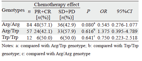 1.3 统计学方法采用SPSS17.0软件进行统计学处理。以χ2检验比较各基因型化疗敏感度的差异,以比值比(Odds ratio,OR)及其95%可信区间(95% CI)表示相对危险度,P < 0.05为差异有统计学意义,以拟合优度χ2检验明确各个基因型是否符合群体遗传学Hardy-Weinberg平衡,P < 0.1为差异有统计学意义,以上均为双侧检验。