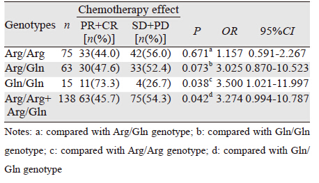 XRCC1 codon194和codon399的SNP与铂类化疗敏感度的关系,见表 3、4。进一步分析可见:XRCC1 194Arg/Arg、Arg/Trp、Trp/Trp基因型两两比较,化疗敏感度差异无明显统计学意义(P>0.05),XRCC1 codon399 Gln/Gln基因型化疗敏感度明显高于Arg/Arg基因型,其化疗敏感度为Arg/Arg基因型的3.500倍(P < 0.05,95% CI=1.021~11.997)。不含Arg基因型(Gln/Gln)化疗敏感度为含Arg基因型(Arg/Arg和Arg/Gln)的3.274倍(P < 0.05,95% CI:0.994~10.787)。