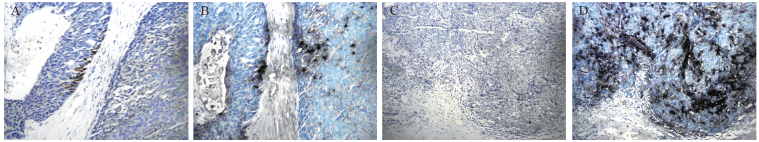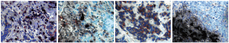 | 图 1 乳腺浸润性导管癌组织中ALDH1/CD133各种表型细胞(SP×400) Figure 1 ALDH1/CD133 phenotypic cells in breast invasive ductal carcinoma tissues (SP×400) |