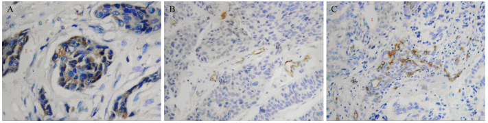 | 图 2 VEGF、CD34和CD105在乳腺浸润性导管癌组织中的阳性表达(SP ×200) Figure 2 Positive expression of VEGF, CD34 and CD105 in breast invasive ductal carcinoma tissues (SP ×200) |