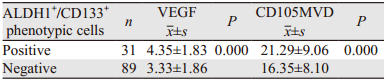 1.2.2 检测方法ALDH1与CD133共染色采用免疫组织化学双染SP法,组织在pH8.0的EDTA修复液中进行高压抗原修复,染色方法依照说明书,先进行ALDH1染色,采用BCIP/NBT显色系统,阳性信号呈蓝黑色;然后进行CD133染色,采用AEC显色系统,阳性信号呈红色。CD34、CD105、VEGF为SP法单染,高压抗原修复,DAB显色,阳性信号呈棕黄色。