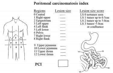 2.4.1 细胞减灭术由于单纯PC的转移病灶多局限于腹膜及腹腔内脏器表面,通过原发病灶切除、腹膜切除、淋巴结清扫以及转移病灶清除等技术,可以将腹腔内肉眼可见病灶全部切除,达到"组织学根治"。但由于患者整体状况、现有技术设备条件、围手术期处理水平、腹膜扩散程度、远处转移以及手术风险和并发症等原因,并非所有患者均能清除所有病灶,因此Sugarbaker[20, 21]提出了腹膜癌指数(peritoneal carcinomatosis index,PCI)和细胞减灭程度(completeness of cytoreduction score,CCR)的概念,用于评估PC状态,PCI评分将腹部分为13个区域:包括"九分法"的9个区域,并将小肠及肠系膜分为4个区域,见图 1。评分标准为:0分:无可见肿瘤;1分:肿瘤直径≤0.5 cm;2分:肿瘤直径>0.5 cm~≤5.0 cm;3分:肿瘤直径>5.0 cm或融合。上述评分总和即为PCI,最高39分。而CCR评分标准为:0分:CRS后无腹膜残余瘤;1分:残余瘤直径<2.5 mm;2分:残余瘤直径2.5 mm~2.5 cm;3分:残余瘤直径>2.5 cm或存在无法切除的病灶。杨肖军等[22]研究显示,低PCI (PCI≤20)和高PCI (PCI>20)者生存期为27.7月和6.4月,差异有统计学意义。CCR-0、CCR-1、CCR-2&3者生存期为43.4月、9.4月和8.3月(P=0.001,CCR-0与CCR1-3比)。多因素分析显示PCI评分和CCR评分是胃癌PC患者的独立预后因素。两项评分标准对于胃癌PC患者临床治疗及患者预后具有重要的指导意义。