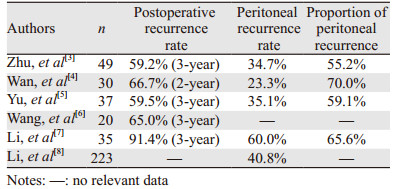 胃癌是我国最常见的恶性肿瘤之一,全世界每年新发胃癌约98.96万例,70%发生于包括我国在内的发展中国家[1]。大多数病例在确诊时已处于进展期,传统治疗手段包括手术治疗及系统性化疗已难以达到治愈。国内研究显示,55.6%~91.4%的胃癌患者于接受根治性手术后3年内复发,其中55.2%~70.0%为腹膜复发,见表 1,说明腹膜复发是我国胃癌患者根治性手术治疗失败的主因。胃癌腹膜转移形成腹膜癌(peritonealcarcinomatosis,PC),主要表现为顽固性腹痛、难治性腹水及快速进展性肠梗阻[2],预后很差,中位生存期不足6月。