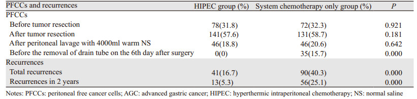 李保中等[8]研究了468例进展期胃癌(advanced gastric cancer,AGC)根治性切除术患者,分别于肿瘤切除前、后及灌注化疗后收集腹腔液体,行腹腔液脱落癌细胞检查,结果显示,AGC患者接受根治性手术并常规冲洗腹腔后,PFCCs阳性率为20.6%,而术后6天拔管时患者PFCCs阳性率仍高达15.7%。该组患者术后接受常规系统性化疗,至随访结束共有40.3%的患者出现复发,2年内复发率为25.1%。热灌注化疗组患者通过手术预留的腹腔灌注通道,于手术当天以及术后第1~5天每天接受腹腔热灌注化疗(hyperthermic intraperitoneal chemotherapy,HIPEC)1~2 h,灌注化疗药物为:羟基喜树碱、顺铂、氟尿嘧啶和香菇多糖,总灌洗量5 000 ml/d。该组患者术后第6天拔管时PFCCs阳性率为0,而术后复发率也显著低于单纯化疗组,见表 2。由此可见,PFCCs是导致胃癌患者术后复发的重要原因,而HIPEC可以有效清除PFCCs,减少复发,改善患者预后。
