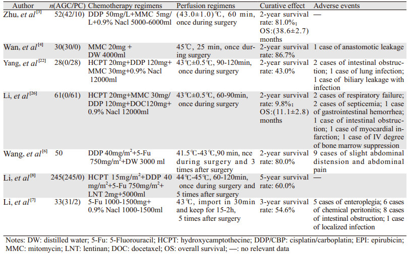 2.3 手术治疗胃癌PC患者行姑息性手术的主要目的在于缓解症状,降低出血、穿孔等并发症风险,为其他综合治疗提供条件。丁友成等[17]比较了57例胃癌PC患者的临床病理特征及治疗结果,生存分析表明行姑息性切除的患者的生存时间明显长于未行手术切除者。Cox回归多因素分析显示手术切除是影响预后的唯一因素。吴晖等[18]研究显示:胃癌腹膜种植区域在结肠上区组的患者,淋巴结清扫组与淋巴结未清扫组比较,中位生存期以及1、3、5年生存率均有明显差异,因此适度的淋巴结清扫可显著延长胃癌PC患者生存期,在能够达到病灶全切除时,应行规范的淋巴结清扫。李正荣等[19]研究也显示胃癌PC患者姑息性切除组和未切除组的生存率差异具有统计学意义,切除组中位生存期(13.6月)长于未切除组(4.5月)。
