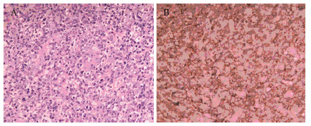 | A:gastric mucosa diffuse large B-cell lymphoma (HE ×100);B:gastric mucosa diffuse large B-cell lymphoma CD20(+)(IHC ×100) 图 1 胃弥漫性大B细胞性淋巴瘤病理观察 Figure 1 Pathological observation of gastric diffuse large B-cell lymphoma |