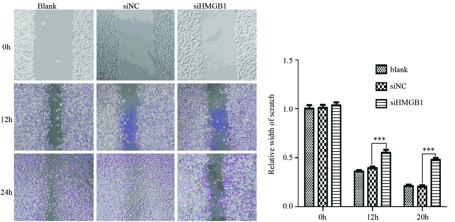 1.2.3 细胞划痕试验取生长良好、空白对照(Blank)、干扰HMGB1(siHMGB1)及阴性对照(siNC)的C666-1细胞,调整细胞浓度为每毫升1×105,按照每孔100 μl接种细胞于6孔板中培养,待细胞长满培养皿,用200 μl微量移液头在6孔板上纵轴直线划痕,PBS轻柔洗涤细胞以去除漂浮细胞。沿划痕边缘作5处等距离标记为数据测定点。分别于0和24 h倒置显微镜下测量。相差显微镜测量各组细胞划痕宽度,并比较划痕宽度。实验重复三次。