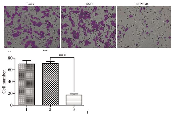 | 1: blank group; 2: siNC group; 3: siHMGB1 group; ***: P=0.000, compared with the siNC group 图 2 siHMGB1抑制NPC细胞株C666-1的侵袭 Figure 2 siHMGB1 inhibited invasion of NPC cell line C666-1 |