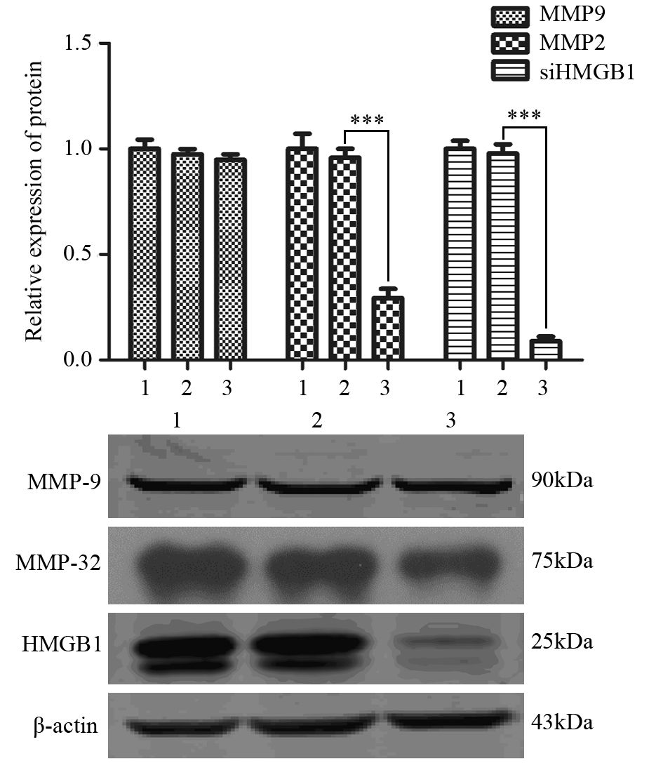 | 1: blank group; 2: siNC group; 3: siHMGB1 group; ***: P all=0.000 图 3 siHMGB1抑制NPC C666-1细胞株侵袭转移相关蛋白 MMP2的表达 Figure 3 siHMGB1 inhibited invasion-related protein MMP2 expression in NPC cell line C666-1 |