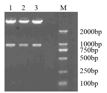 | M: DL2000; 1: pBSilence1.1-cortactin-shRNA1; 2: pBSilence1.1-cortactin-shRNA2; 3: pBSilence1.1-cortactin-shRNA3 图 1 重组质粒的酶切电泳图 Figure 1 Restriction map of recombinant plasmid |