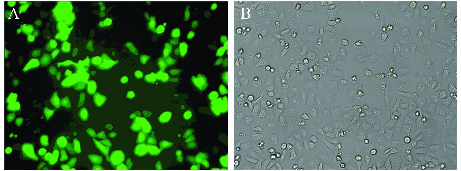 | A: Image under fluorescent microscope; B: Same image under ordinary microscope 图 2 重组质粒的转染情况(×100) Figure 2 Transfection efficiency of recombinant plasmid (×100) |