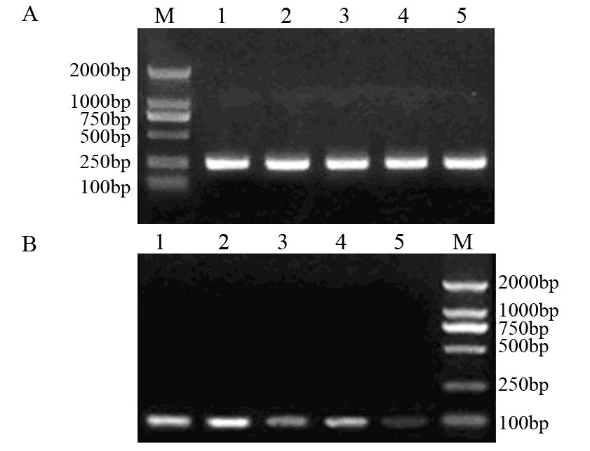 | A: β-actin; B: cortactin mRNA; M: marker DL2000 ; 1: blank control group; 2: negative control group; 3: pBSilence1.1-cortactin-shRNA1 group; 4: pBSilence1.1-cortactin-shRNA2 group; 5: pBSilence1.1- cortactin-shRNA3 group 图 3 各实验组HepG2细胞cortactin基因mRNA的表达情况 Figure 3 mRNA expression of cortactin in HepG2 cells of each experimental group |