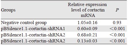 1.2.4 RT-PCR检测各组HepG2细胞中cortactinmRNA的表达根据GenBank中的cortactin基因序列,用Premier5.0软件设计PCR引物,序列如下:上游:5’-GAGCAAGCCAGAGCCAAAAC-3’,下游:5’-AAGCCGCATCCTCATAGACG-3’,扩增片段长100 bp。内参β-actin基因引物序列如下:上游:5’-CACGATGGAGGGGCCGGACTCATC-3’,下游:5’-TAAAGACCTCTATGCCAACACA-GT-3,扩增片段长240 bp。质粒转染24 h后用TRIzol试剂按说明书方法抽提各组HepG2细胞中总RNA,分光光度计测定RNA浓度。以稀释10倍后的反转录产物cDNA为模板进行Real-time PCR反应,反应条件:50℃ 2 min,95℃ 10 min;95℃ 30 s,60℃ 30 s,40个循环。反应后,以β-actin作为内参,分析ABI via7系统导出数据。cortactin基因mRNA相对表达值(relative expression,RQ)采用ΔΔCt方法计算,即RQ=2ΔΔCt。ΔΔCt以空白对照组为标准,如ΔΔCt阴性对照组=ΔCt阴性对照组-ΔCt空白对照组。ΔCt=CtHomo cortactin-CtHomo β-actin。空白对照组RQ=20=1。每组实验重复3次。