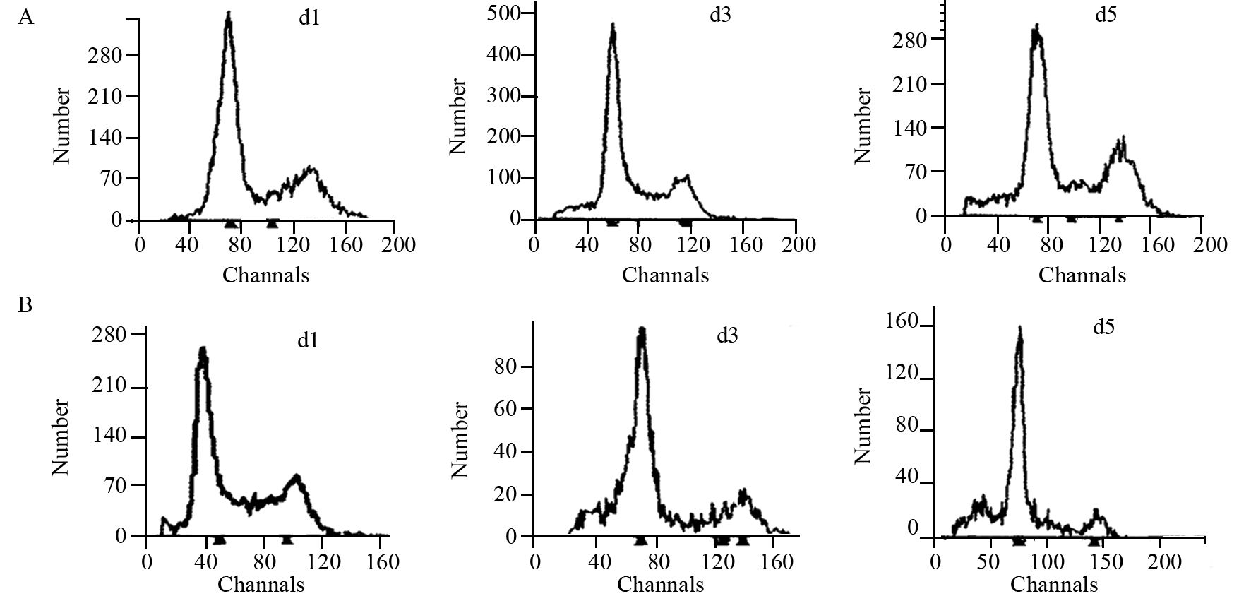 1.2.5 流式细胞仪检测细胞周期和凋亡收集各组不同培养天数的细胞3×105个。Annexin V-碘化丙锭(PI)双染法检测细胞凋亡,按说明书操作。70%乙醇4℃固定过夜;加入PI,室温下避光孵育30min,流式细胞仪检测细胞周期分布和凋亡率。