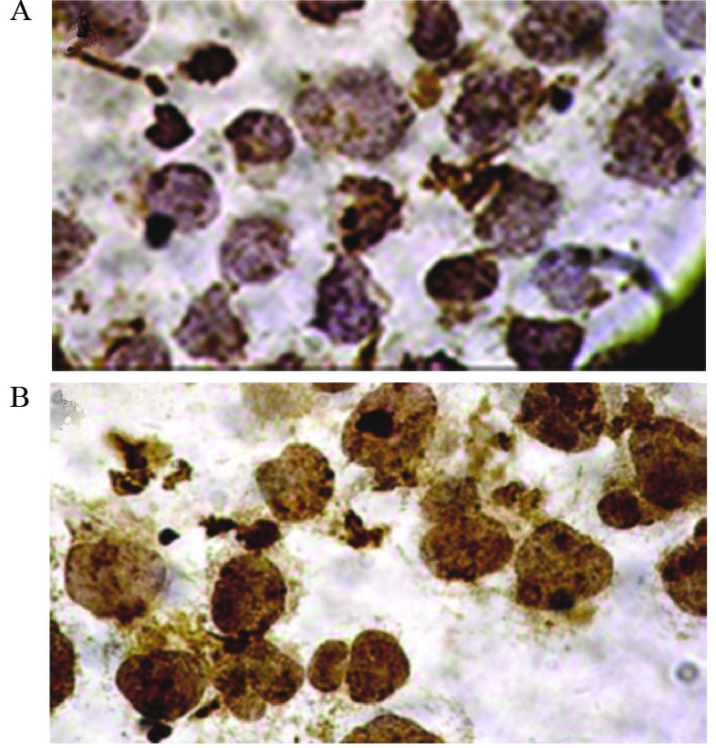 分别于转染后第1、3、5天收集各组细胞,流式细胞仪检测细胞周期发现过表达SHP-1后,K562细胞增殖指数下降,K562SHP-1细胞较K562EGFP 细胞G0/G1期细胞比例逐渐增加,而G2/M+S期细胞比例逐渐减少,第1天两组细胞比较差异无统计学意义(P=1.000),第3、5天两组细胞比较差异有统计学意义(P值分别为0.004、0.001),见图 3、表 1。TUNEL法检测转染后第5天细胞凋亡结果显示,K562SHP-1细胞凋亡率为(37.8±4.3)%,明显高于K562EGFP细胞(5.7±1.4)%,两组比较,差异有统计学意义(P=0.000)。细胞中棕黄色颗粒为凋亡细胞,见图 4。
