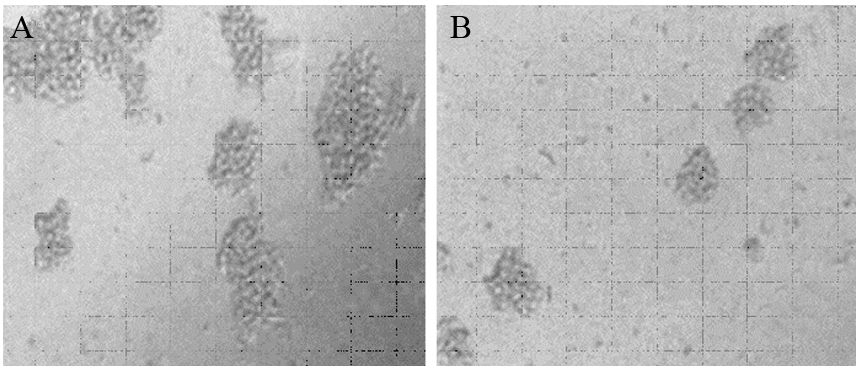 | A: K562EGFP cells; B: K562SHP-1 cells 图 5 过表达SHP-1对K562细胞集落形成的影响 (×100) Figure 5 Effect of SHP-1 overexpression on colony formulation of K562 cells (×100) |