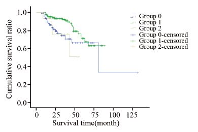 1.3 统计学方法采用SPSS17.00统计软件进行分析。随访收集患者生存时间与终点事件(死亡),对生存时间采用Log rank生存分析,计算中位生存时间并绘制Kaplan-Meier生存曲线。同时对三组数据采用Logrank法进行两两比较分析,P值采用Bonferroni法进行校正。所有分析均采用双侧,P<0.05为差异有统计学意义。