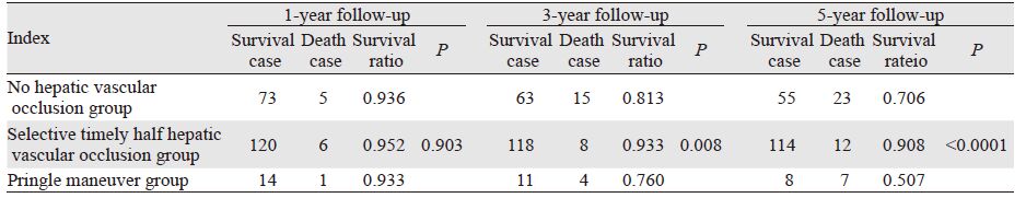 中位生存时间比较:无肝门阻断组5年中位生存时间为25月,选择性适时半肝血流阻断组为41月,Pringle法为21月。采用Log rank法对三组5年中位生存时间进行两两比较分析发现,选择性适时半肝血流阻断与无肝门阻断和Pringle法组患者中位生存时间差异有统计学意义(χ2值分别为5.41、4.219,P值为0.02、0.04)。无肝门阻断组与Pringle法组患者中位生存时间比较,差异无统计学意义(χ2=0.05,P=0.823);选择性适时半肝血流阻断组中位生存时间优于其他两组。