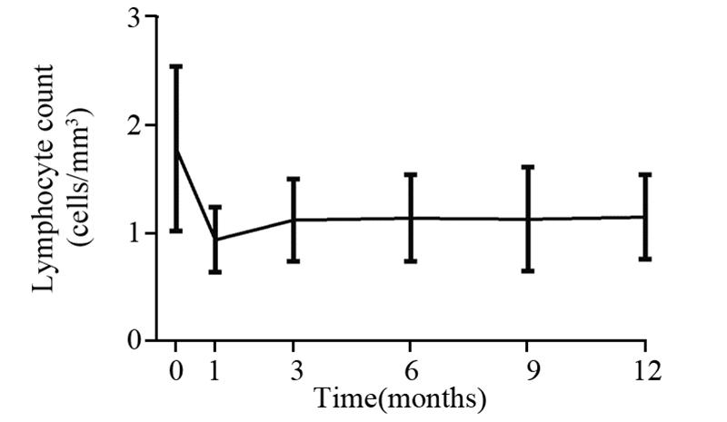 | 图 1 112例食管癌患者血淋巴细胞计数在放疗前及治疗后12月内变化趋势图 Figure 1 Lymphocyte count trend before and within 12 months after radiotherapy on 112 esophageal carcinoma patients |