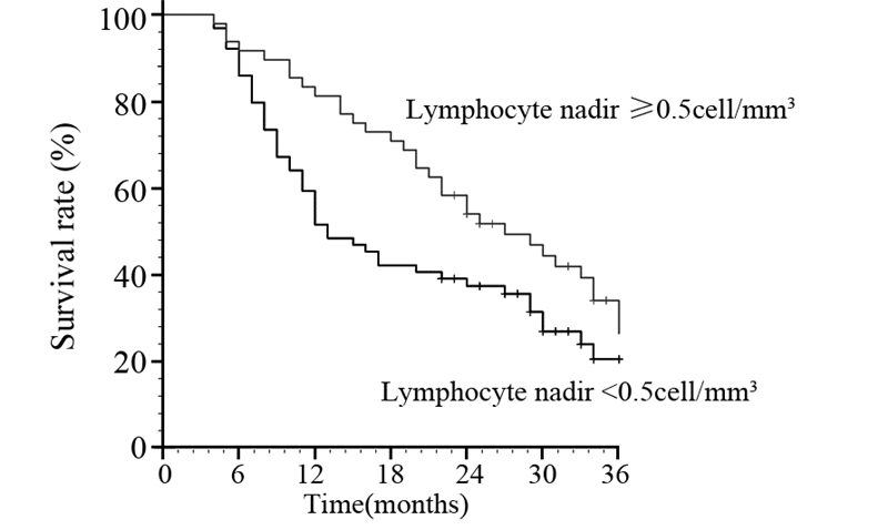 | 图 2 食管癌患者治疗期间淋巴细胞最低值<0.5个/毫米3组 及≥0.5个/毫米3组患者的生存曲线 Figure 2 Kaplan-Meyer survival curves of esophageal carcinoma patients with lymphocyte nadirs < 0.5 cell/mm3 and ≥0.5 cell/mm3 during treatment |