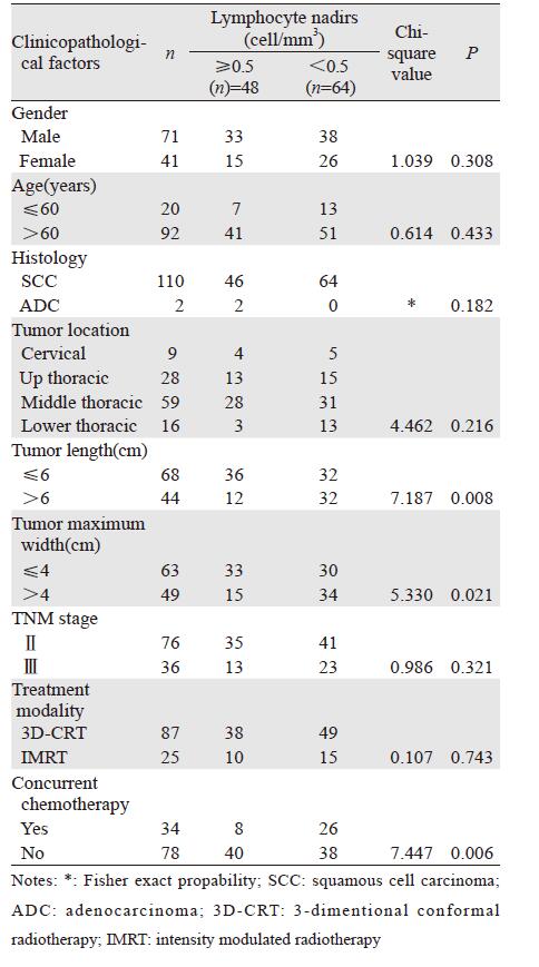 淋巴细胞可特异性识别并杀伤肿瘤细胞或释放一系列细胞因子激活免疫系统,在肿瘤免疫反应方面起重要作用。淋巴细胞对辐射敏感,放疗可以杀伤循环血中的淋巴细胞从而干扰宿主免疫抗肿瘤效应。既往研究表明放疗所致的淋巴细胞降低在有的肿瘤中提示预后不良,如非小细胞肺癌[1, 2]、胰腺癌[3],脑胶质瘤[4]及头颈部癌[5],但有关放疗过程中的淋巴细胞抑制与临床病理因素的关系以及与食管癌疗效、预后关系的报道较少,本研究拟探讨初诊食管癌患者接受根治性放疗过程中淋巴细胞最低值与食管癌疗效和预后的关系。