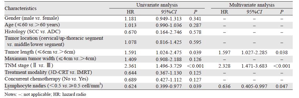 2.4 放疗期间淋巴细胞最低值和患者预后的关系生存分析显示淋巴细胞最低值<0.5个/毫米3组生存差于≥0.5个/毫米3组(χ2=4.489, P=0.034),见图 2。两组1年及2年生存率分别为51.6%、37.4%及81.3%、54.0%。单因素及多因素Cox回归分析均显示,疾病TNM分期、病变长度及放疗期间淋巴细胞最低值是影响OS的独立因素,见表 2。