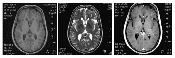 | MRI showed a lesion in the left frontal lobe (case 3), which was hypointensity on both T1(A)- and T2-(B) weighted imaging without enhancement(C) 图 1 散发型脑膜血管瘤病患者的MRI Figure 1 MRI f inding s o f spo r adi c meningioangiomatosis patients |