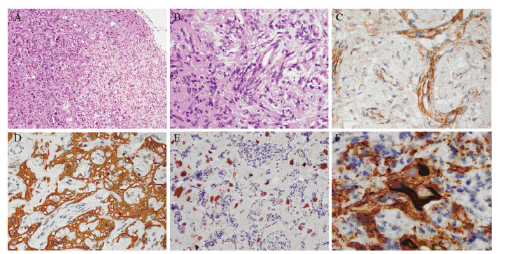 血管及血管周围梭形细胞vimentin阳性;7例病例中,3例梭形细胞成分EMA局灶阳性,见图 2C,4例阴性;3例梭形细胞成分PR个别细胞阳性,4例阴性;神经胶质GFAP阳性,见图 2D;神经元Syn、NeuN阳性,见图 2E;神经元纤维缠结Tau蛋白阳性,见图 2F;病灶内细胞增殖指数Ki67低于1%。