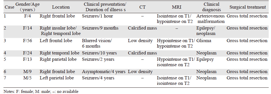 回顾性分析福建医科大学附属第一医院2012年6月—2014年11月手术治疗的7例MA。7例MA均为散发型,其中5例发生于右侧大脑半球,2例发生于左侧大脑半球。男性2例,女性5例,男女之比2:5。年龄4~56岁,平均17.86岁。首发症状为癫痫发作者5例,视物模糊者1例,发现肿块但无症状者1例,病程从1小时~10年。7例病例中收集到4例CT和4例MRI检查资料,其中6例表现为占位性病变。CT检查2例显示高密度钙化影,1例显示稍低密度影,1例显示低密度影;MRI检查结果分别为等T1短T2、长T1短T2、长T1等T2、等T1等T2各1例;对比增强扫描3例未见明显强化,1例明显均匀强化。典型病例例3见图 1。术前临床诊断困难,无一例诊断明确。7例均行肿瘤全切术,术后均未行放化疗。随访时间1~29月,均无复发,截止本次随访,所有病例无瘤生存,见表 1。