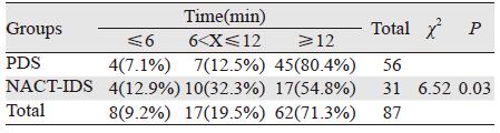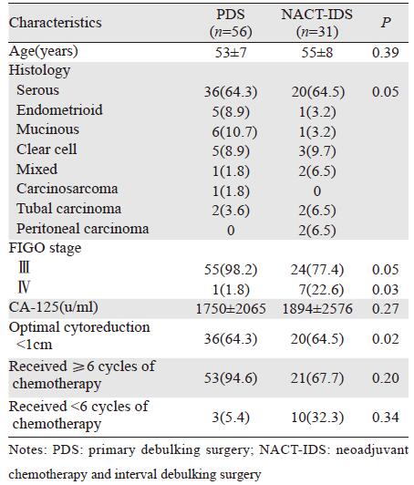 按照治疗方法的不同,将两组患者分为PDS组及NACT-IDS组(56例 vs. 31例),其平均年龄、术前CA125值、满意肿瘤细胞减灭率差异均无统计学意义(P>0.05),NACT-IDS组有较高的Ⅳ期患病率(22.6% vs. 1.8%),PDS组术后接受6周期以上的紫杉醇联合铂类药物化疗者人数较多,但组间差异均无统计学意义(P=0.2)。