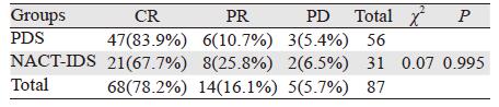 2.2 疗效分析比较所有化疗疗程完成后,对患者疗效进行评估,总体化疗有效率为94.3%,NACT-IDS组有效率为93.5%;PDS组有效率为94.6%。虽然PDS组术后应用铂类为基础的化疗治疗反应率稍高,但并不优于NACT-IDS组(χ2=0.07, P=0.995),见表 2。