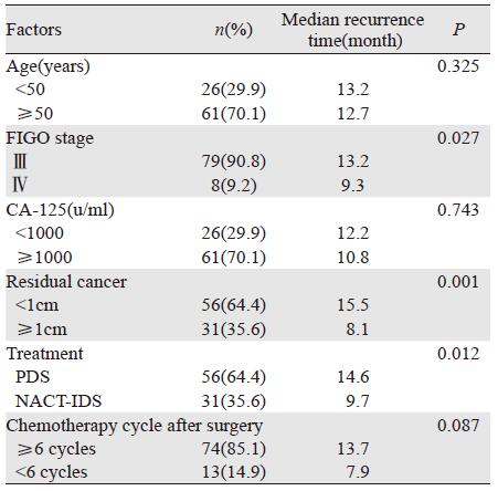 晚期卵巢上皮癌是目前病死率最高的妇科恶性肿瘤,虽然经过数十年不懈研究和努力,即使患者接受规范手术和化疗,75%患者仍在2~3年内复发,其5年生存率始终徘徊在20%~35%,无病生存时间和生存率一直未能取得突破性进展[1]。目前晚期卵巢上皮癌的标准治疗方案仍是初始肿瘤细胞减灭术(primary debulking surgery, PDS)辅以铂类药物的联合化疗[2]。然而晚期卵巢癌患者中接受PDS能达到满意肿瘤细胞减灭者(optimal cytoreduction)仅为30%~60% [3],针对未能达到满意的肿瘤细胞减灭的患者以及高龄、有合并症等不适合直接手术的患者,新辅助化疗(neoadjuvant chemotherapy, NACT)联合间隔性细胞减灭术(interval debulking surgery, IDS)成为了治疗的另一选择。本研究对87例临床病理分期为Ⅲ期和Ⅳ期的卵巢上皮癌患者病历资料进行回顾性分析,探讨两种治疗方式对患者首次复发时间的影响,并分析产生铂类药物耐药的相关因素。