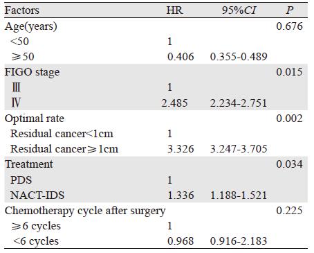选择年龄、临床分期、治疗方式、术后化疗次数、手术残留病灶大小等几方面为自变量,复发时间为被解释变量,建立逐步回归模型,结果对铂类药物耐药有显著影响的指标是手术残留病灶≥1 cm(HR=3.326,P=0.002)、临床分期(HR=2.485, P=0.027)和治疗方式(HR=1.336, P=0.034),见表 5。