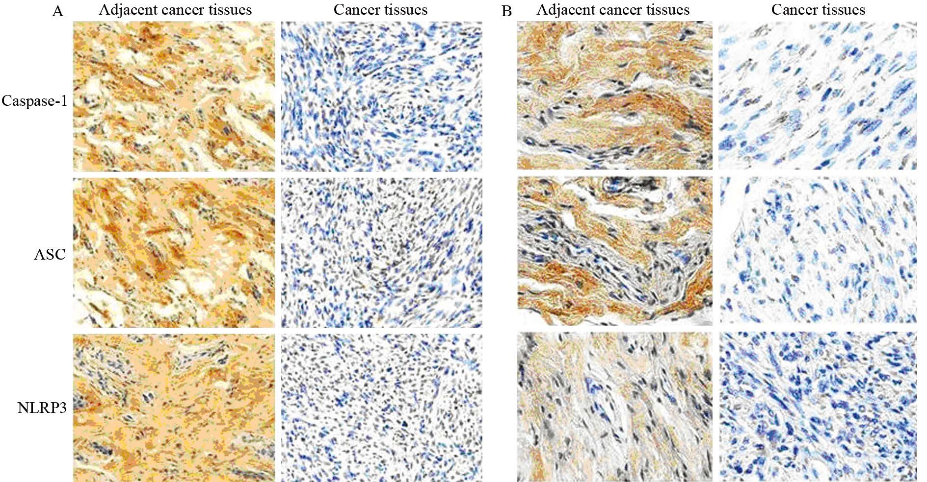 | A: ×200; B: ×400; ASC: apoptosis-associated speck-like protein containing a carboxy-terminal CARD; NLRP3: nucleotide-binding domain leucinerichrepeat-containing protein 3 图 1 低度恶性肌纤维母细胞肉瘤组织和瘤旁组织中NLRP3炎性体Caspase-1、ASC和NLRP3蛋白的表达 Figure 1 Expression of three NLRP3 inflammasome proteins in LGMS and adjacent cancer tissues detected by immunohistochemistry |