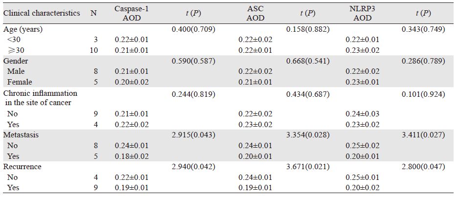 LGMS转移患者和复发患者瘤组织中Caspase-1、 ASC和NLRP3蛋白表达明显低于未发生转移患者和 原发肿瘤患者(P<0.05);而与年龄、性别和原发部 位是否有慢性炎性反应无关(P>0.05),见表 2。
