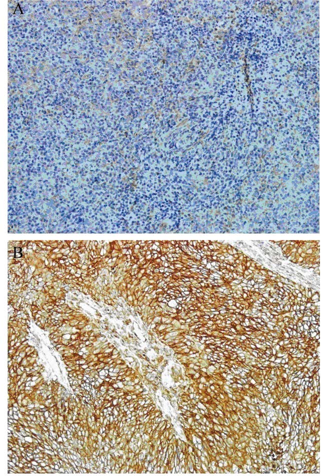 | A: negative Annexin A2 expression of nasopharyngeal carcinoma(NPC) tissues; B: positive Annexin A2 expression of NPC tissues 图 1 鼻咽癌组织中Annexin A2的表达 (Elivision ×200) Figure 1 Annexin A2 expression in NPC tissues (Elivision ×200) |