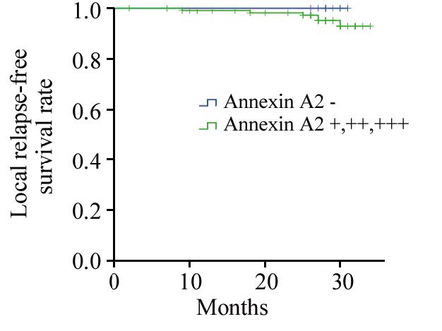 | 图 2 Annexin A2表达与鼻咽癌放射治疗后无局部复发生存率的关系 Figure 2 Relationship between Annexin A2 expression andlocal recurrence-free survival rate after radiotherapy on nasopharyngeal carcinoma patients |